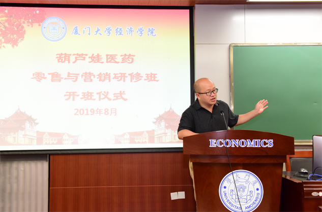 在开班仪式上,廖景峰主任首先代表厦门大学经济学院热烈欢迎俄罗斯专享会294医药零售与营销研修班的学员到厦大学习,并就厦门大学及经济学院的相关情况进行了介绍。他说,俄罗斯专享会294学员走进厦大就是厦大的校友,希望未来的日子能够关心、支持母校的发展,多提宝贵意见,同时他也祝大家在厦大学习期间学有所成、学有所获。